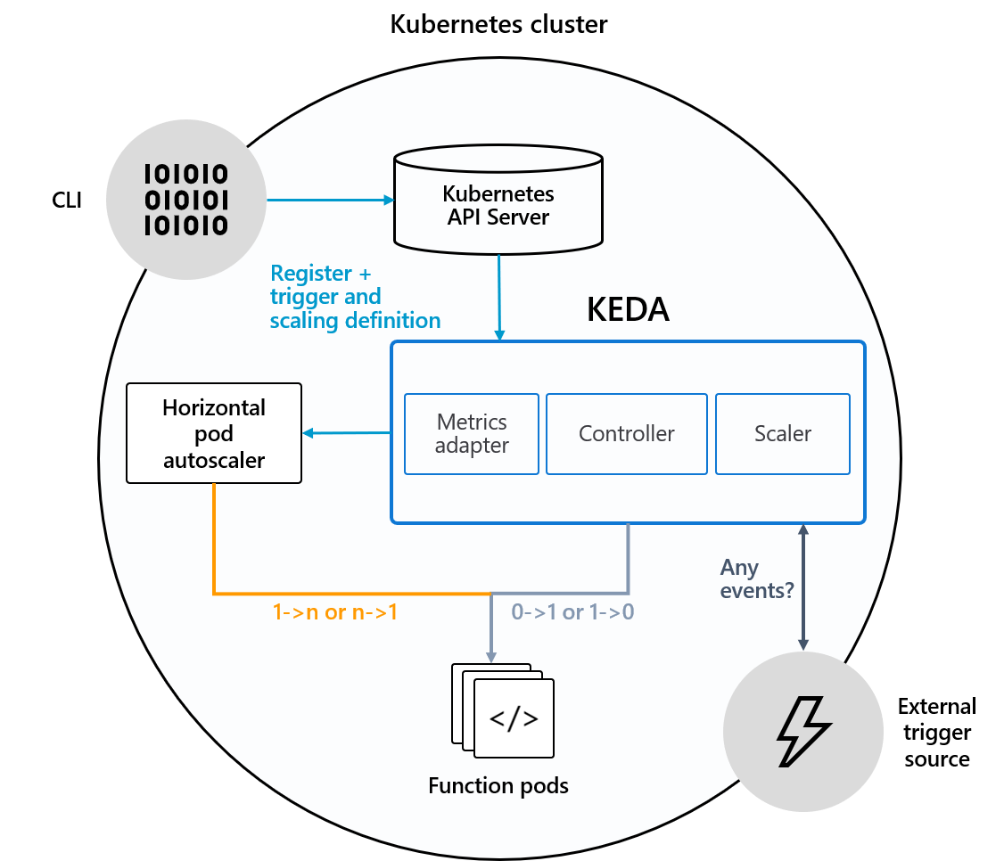 從這個架構圖,我們看到KEDA包含了3個組件,Metric Adapter給k8s的HPA提供度量指標讓其進行1-n/n-1的伸縮,Controller控制Pod進行1-0/0-1的伸縮,Scaler偵聽配置的觸發器所觸發的事件。