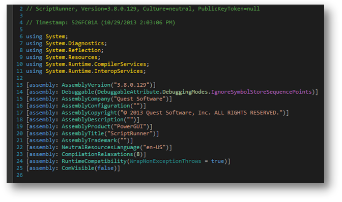 對PowerWare的初步分析显示,該樣本為.NET可執行文件,在使用一款名為dnSpy的.NET反編譯程序對其進行細緻檢查后,我們在Quest Software上發現有“PowerGUI”字樣显示,於是我們立刻意識到這一惡意軟件使用的是PowerShell 腳本編輯器,其可將PowerShell腳本轉換為Microsoft可執行文件。