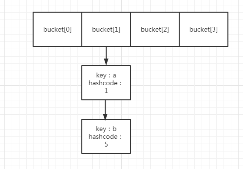 以前面為例,哈希表一共4個桶,其中bucket[1]裏面,存放了兩個元素,假設是a、b,其hashcode分別是1,5.
