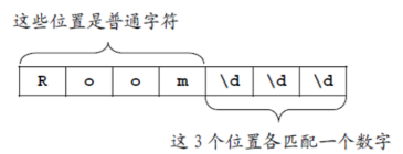 把文本看作是字符流,每個字符放在一個位置上,例如,正則表達式 “Room\d\d\d”,前面四個字符Room是普通字符,後面的字符\是轉義字符,和後面的字符d組成一個元字符\d,表示該位置上有任意一個数字。
