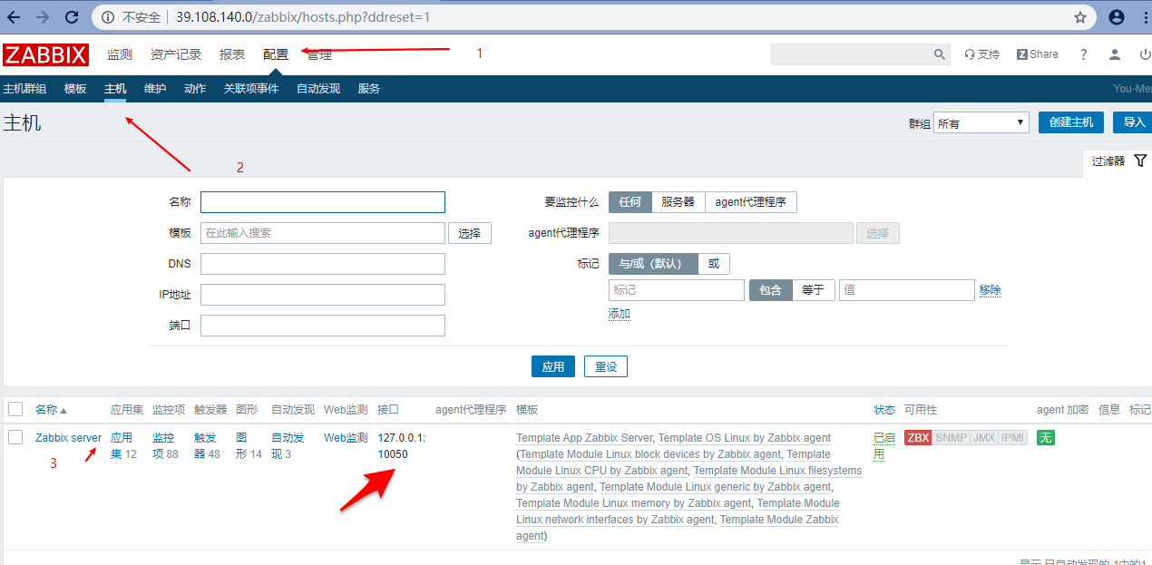 接下來我們到web界面上配置如何監控本地主機,我們看到接口上是127.0.0.1,但是我們配置文件寫的是39.108.140.0,我們讓這兩個IP一致.點擊3進去然後修改.