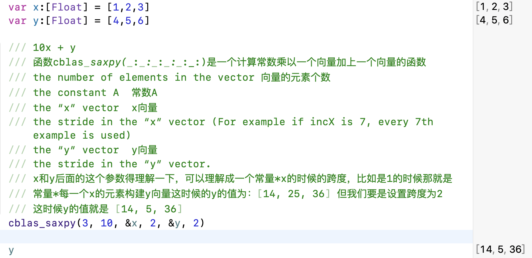 var x:[Float] = [1,2,3] var y:[Float] = [4,5,6] cblas_saxpy(3, 10, &x, 2, &y, 2)