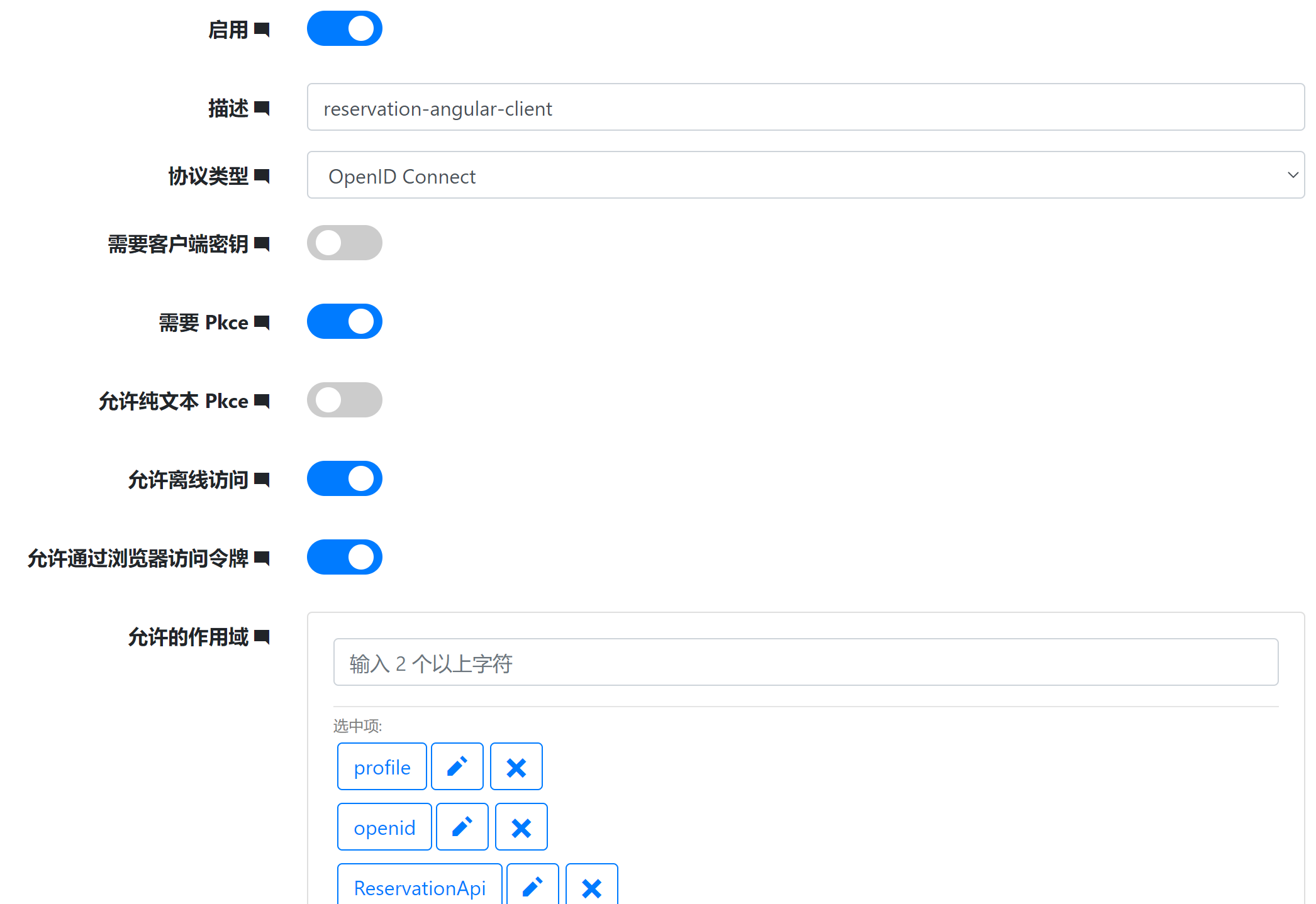 允許的作用域(scope) 是客戶端允許訪問的 api 資源和用戶的信息資源,openid 必選,profile 是默認的用戶基本信息的集合,根據自己客戶端的需要進行配置,ReservationApi 是訪問 API 需要的 scope,其他的 scope 根據客戶端需要進行配置