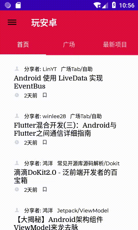 儘管 Jetpack Compose 還只是預覽版,API 可能發生變化,缺乏足夠的控件支持,甚至不是那麼穩定,但這阻止不了我這顆好奇的心。我在第一時間就上手擼了一款 Compose 版本 Wanandroid 應用,功能也比較簡單,僅僅包括首頁,廣告和最新項目,類似於 Android 原生頁面的 Viewpager + TabLayout 。下面的 gif 展示了應用的基本頁面:
