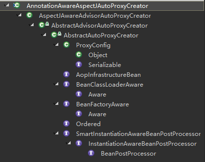 通過前面的學習我們了解了可以通過Spring自定義配置完成對AnnotationAwareAspectJAutoProxyCreator類型的自動註冊,而這個類到底是做了什麼工作來實現AOP的操作呢?這裏還是先來看一下AnnotationAwareAspectJAutoProxyCreator的類層次結構: